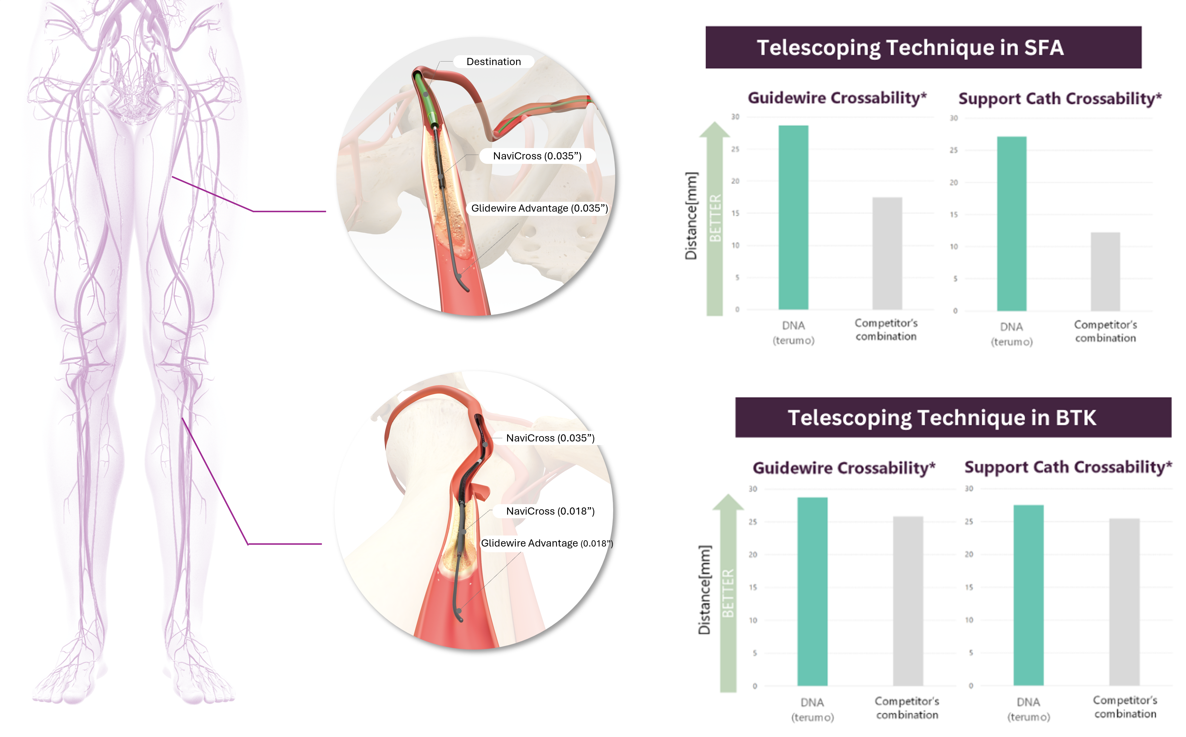 The combined use of D. N. A. products increases device support and pushability, providing better crossability even during complex lower limb interventions.